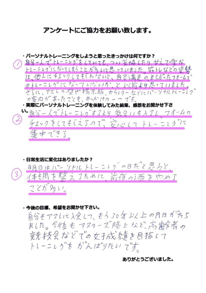 ②自分一人でトレーニングするより気合いも入るし、フォームのチェックをしてもらえるので、安心してトレーニングに集中できる。