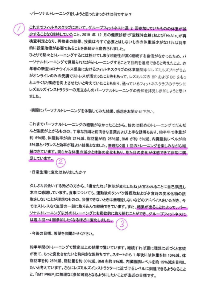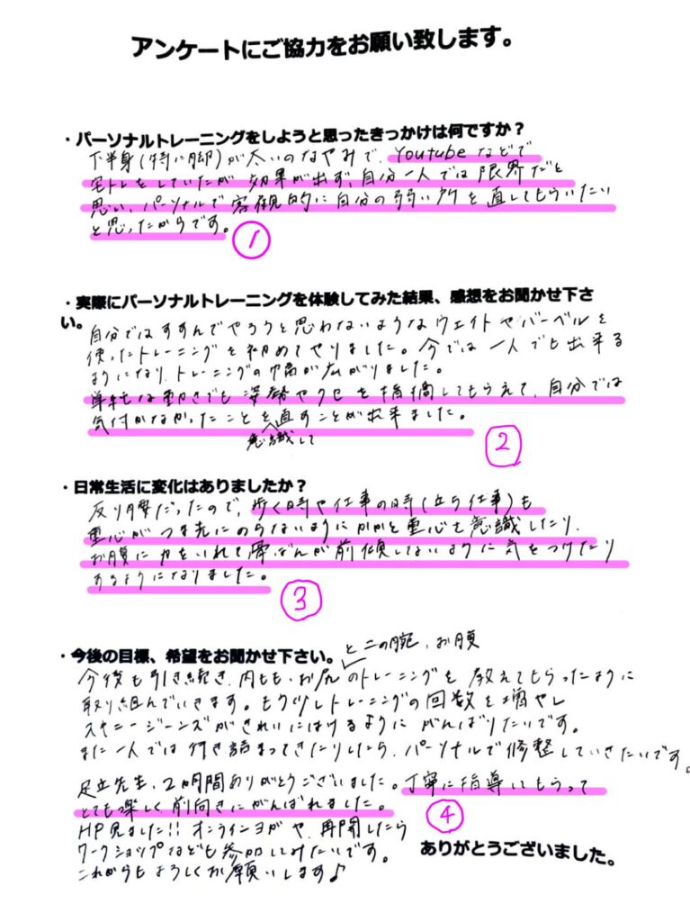 ①YouTubeなどで宅トレをしていたが効果が出ず、自分一人では限界だと思い、パーソナルで客観的に自分の弱い所を直してもらいたいと思ったからです。
